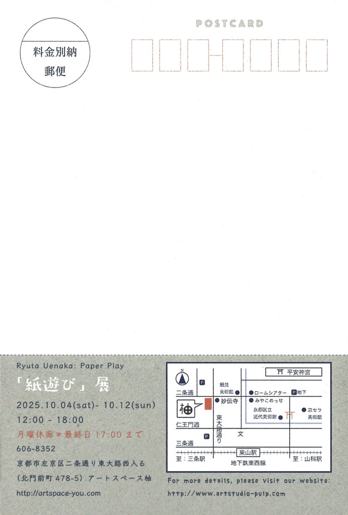 上仲竜太 個展 「紙遊び」展 2025年9月4日 個展 会期10月4日(土)~10月12日(日) ※月曜休廊12時~18時 ※最終日17時まで 川原史絵のRelike Denim展 たなべたい個展・絵本原画展2