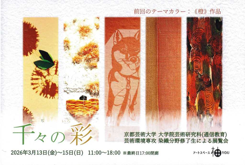 千々の彩(ちぢのいろ) 京都芸術大学 大学院芸術研究科(通信教育)芸術環境専攻 染色分野修了生による展覧会 2026年1月23日 グループ展 Image 会期3月13日(金)~3月15日(日)11時~18時 ※最終日17時まで 出品作家笠原千佐子 川原史絵 日比美由紀 湊優子 森田和子 (さらに…)