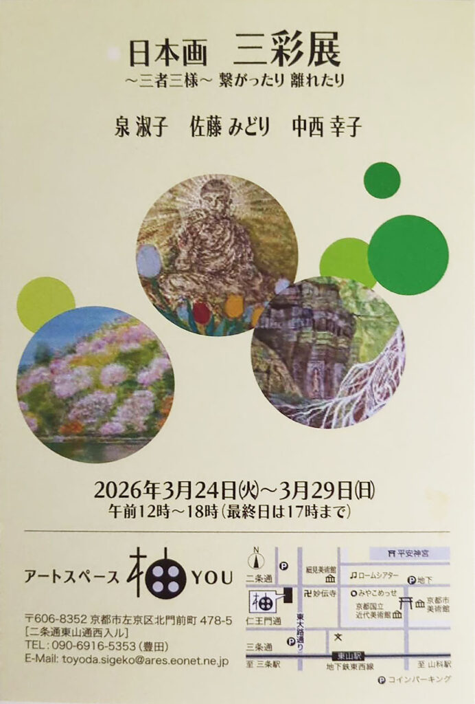日本画 三彩展 ~三者三様~ 繋がったり 離れたり 2026年3月10日 グループ展 会期3月24日(火)~3月29日(日)12時~18時 ※最終日は17時まで 出品作家泉 淑子 佐藤みどり 中西幸子 千々の彩(ちぢのいろ) 京都芸術大学 大学院芸術研究科(通信教育)芸術環境専攻 染色分野修了生による展覧会
